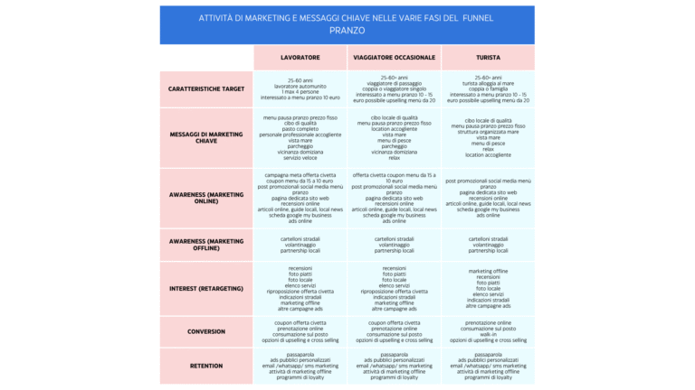 Ogni fase del funnel ha azioni e messaggi personalizzati per ciascun target.