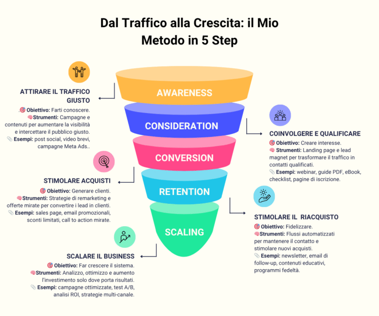 Ti mostro cosa faccio a ogni livello del funnel: dall’attrazione del traffico fino alla fidelizzazione e alla scala. Ogni fase ha obiettivi, strumenti e metriche precise — tutto costruito su misura per il tuo business.